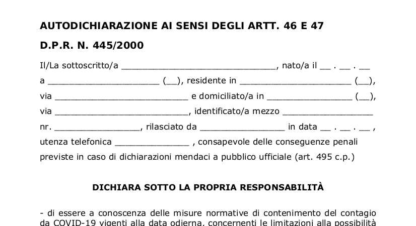 Per comodità riportiamo il modulo di autodichiarazione da scaricare